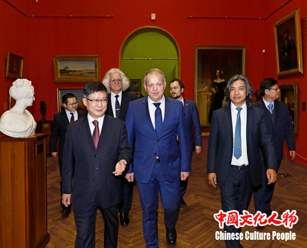 中国驻白俄罗斯大使崔启明,白俄罗斯国家文化部部长邦达里,中国美术馆馆长、中国美术家协会副主席、著名雕塑家吴为山等嘉宾在白俄罗斯国家美术馆馆长弗拉基米尔·普罗科普佐夫的陪同下参观白俄罗斯国家美术馆
