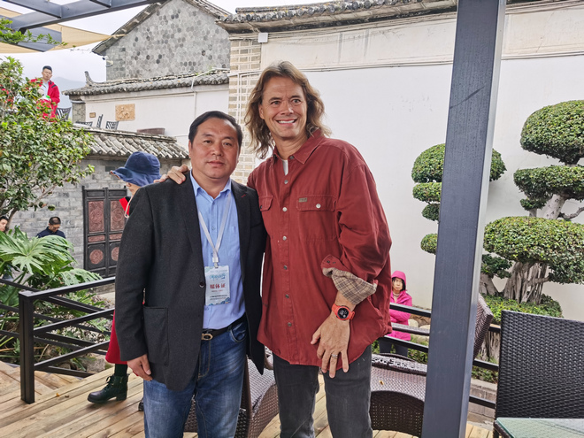 在何利成的客栈院子里,香梨缀满枝头,客人们正在闲适地品茶。院外是一条六七米宽的生态廊道,再往外,是碧水清波的洱海,远处一块大青石上,醒目地镌刻着:“一定要把洱海保护好”。