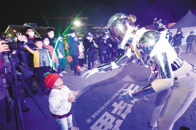 11月1日晚,在北京2020中国科幻大会“科幻之夜”活动中,机器人模仿秀的表演者与小朋友互动。 陈晓根摄(人民视觉)