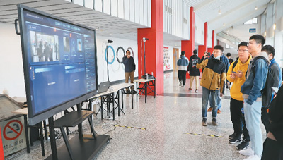 图为江苏大学毕业生在查看智慧就业面部识别系统显示的信息。