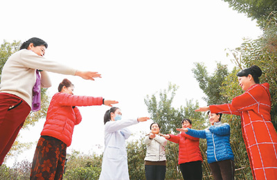 11月14日,河北省邢台市大梁庄乡卫生院医护人员走进社区开展义诊与咨询活动,提高居民糖尿病防护意识。图为医护人员向社区居民教授糖尿病保健操。 张 驰摄(新华社发)