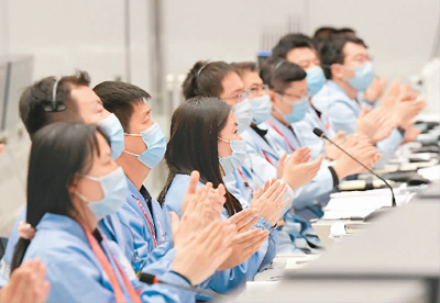 十二月十七日一时五十九分,嫦娥五号返回器携带月球样品在内蒙古四子王旗预定区域安全着陆,探月工程嫦娥五号任务取得圆满成功。图为工作人员在北京航天飞行控制中心嫦娥五号任务飞控现场庆祝。 新华社记者 岳月伟摄