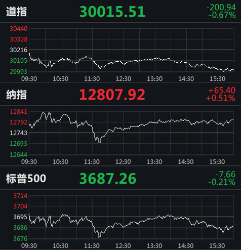 截至美股收盘,道琼斯工业指数跌200.94点,跌幅0.67%,报30015.51点;纳斯达克指数涨65.40点,涨幅0.51%,报12807.92点;标普500指数跌7.66点,跌幅0.21%,报3687.26点。