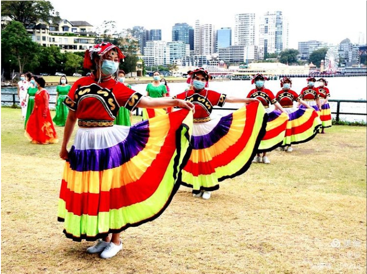 当日上午,澳洲东方歌舞团和澳洲悉尼宋庆龄基金会艺术团、悉尼好心情艺术团、悉尼东方韵模特艺术团、悉尼靓丽艺术团、悉尼模特协会艺术团、悉尼BURWOOD腰鼓队、悉尼WEST RYDE艺术团、悉尼新疆歌舞团的一百多位悉尼华人艺术家们,在世界华人舞蹈协会执行主席、澳洲东方国际舞蹈学院院长、澳洲东方歌舞团团长郑丽莉女士的带领下,身着缤纷多彩的民族服装和中国旗袍,以澳洲悉尼歌剧院、海港大桥为背景,跳起了“站在草原望北京”和“马儿啊你慢些走”等中国舞蹈,妙曼的舞姿送出了澳洲华人对2021年全球华人春晚的祝福,优美的中国音乐旋律回荡在悉尼的上空,吸引了现场许多澳洲人的目光。