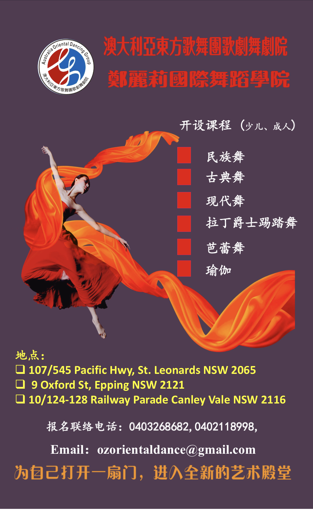 活动由澳洲东方歌舞团团长、郑丽莉国际舞蹈学院院长,被誉为“澳洲舞后”的郑丽莉女士导演并领衔表演