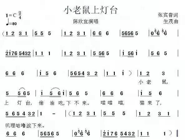 歌曲《小老鼠上灯台》入选人教版全国小学音乐课本二年级下册。入选DVD《世界经典儿歌大全》,由陈欣宜等著名童星演唱。载于许多书刊、网络、光盘,广为流传,妇孺皆知。