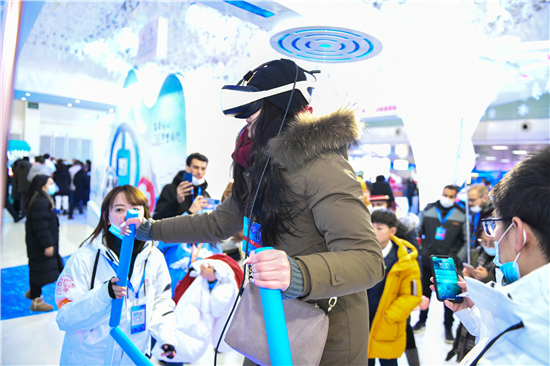 长春,正在此间举行的第五届吉林国际冰雪产业博览会现场。参观者李子彤正在长白山展馆进行VR滑雪体验。随着场景变化,脚下的滑动设备也跟着移动,VR技术将体验者带到了真实的滑雪场,新奇又不乏刺激。