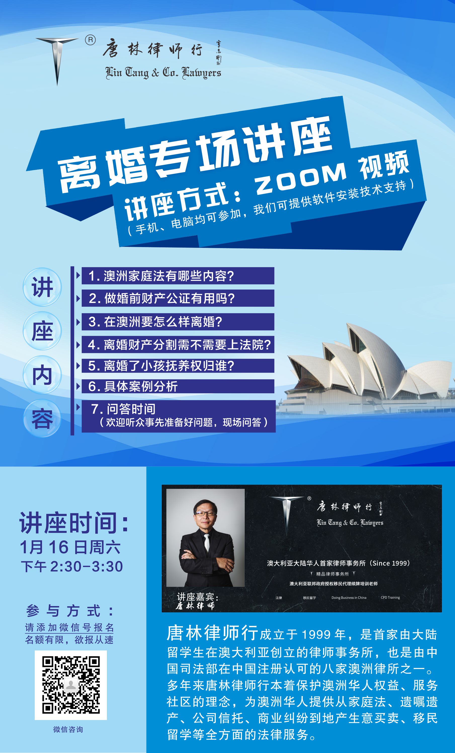 澳华电视传媒(ACTV)悉尼讯(小雨):澳大利亚唐林律师行将于1月16日举办线上澳大利亚家庭法讲座。本讲座旨在服务澳洲华人社区,为免费公益讲座,欢迎扫码添加微信,获取讲座链接。