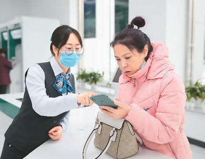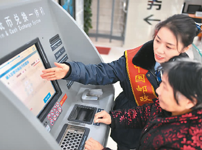 近年来,中国邮政储蓄银行安徽省亳州市分行开展金融服务民生、便民惠民服务活动,提升了现金便民服务水平。图为日前在该市一邮储银行网点,工作人员帮助老人兑换零钱。 刘勤利摄(人民视觉)