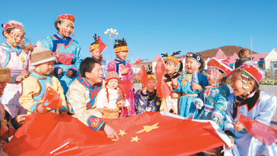 多布库尔猎民村少数民族儿童和五星红旗在一起。