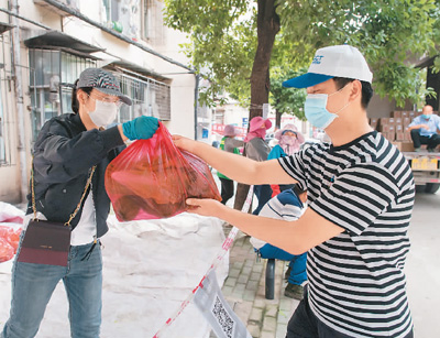 武汉市东西湖区长青街三民小区居民(右)在购买团购菜。 新华社记者 肖艺九摄