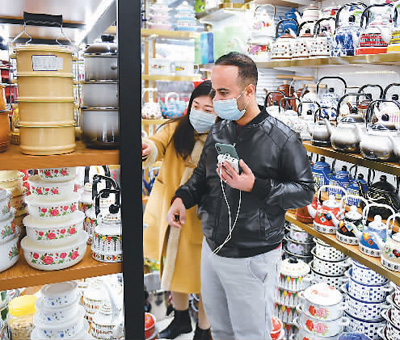 浙江省义乌市统筹做好疫情防控和经济发展,外贸经济保持韧性和活力。图为1月14日,也门客商在义乌国际商贸城选购茶壶。 新华社记者 黄宗治摄