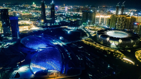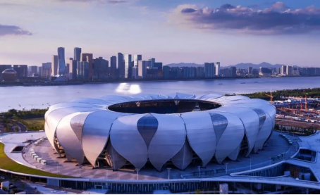 奥体博览城中的“大莲花”,是亚运会的主体育场和田径项目的比赛场地。场馆总建筑面积约21.6万平方米,座席数约8万个。“大莲花”由28片大花瓣和27片小花瓣组成,它的设计理念源于钱塘江水和杭州丝绸,将原本生硬的钢筋骨架转化为呼应场地的柔美曲线,更加柔和飘逸。