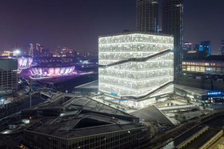 近日,杭州亚运会射击射箭现代五项馆初露样貌。该馆位于富阳区银湖街道,总用地面积约27万平方米,主要包括射击综合馆、新闻媒体与安保中心、飞碟靶场、射箭场、现代五项激光跑和马术场地、马厩等。在射击综合馆的东侧及南侧幕墙上,设置了3.4万块旋转百叶,通过特定的光影效果可以呈现出“活”的《富春山居图》。