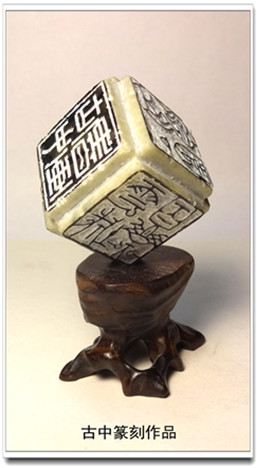篆刻以印材为载体,以篆法、章法、刀法为创作要素,是汉字特有的艺术形式,它是中国传统文化的重要组成部分,迄今已有3700多年历史。据古中介绍,篆刻讲究“篆意、墨趣、刀味、石韵”四结合,篆刻的最高境界全在于“经营于方寸之内,鉴赏于毫发之间”。古中不仅能在两公分见方的印材上雕刻260字的《心经》,也善镌刻重40磅巨印,这足见其技艺非同一般。