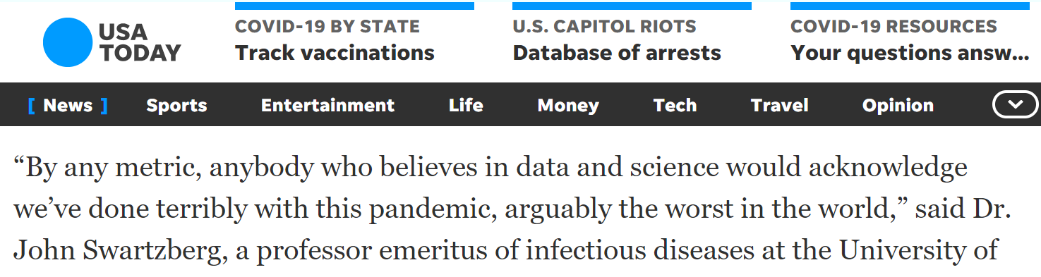 今日美国在19日的报道中讽刺道,“新冠病毒确诊和死亡人数上,美国是无可争议的全球领导者。”文章称,美国新冠死亡人数再创纪录,再次向人们展现了美国这个全球最大的经济体在大流行期间糟糕的表现。
