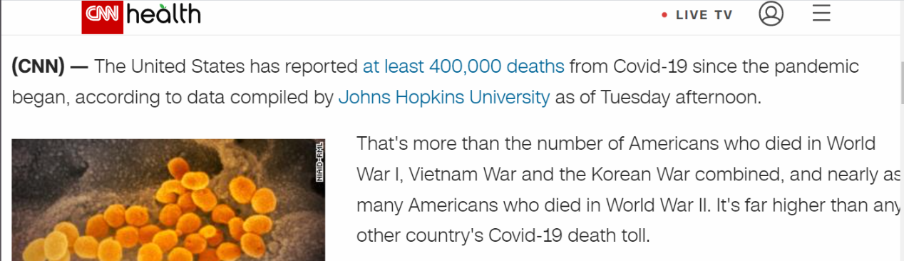 美国有线电视新闻网(CNN)称,40万的死亡人数超过了美国在一战、越南战争和朝鲜战争中死亡人数的总和,接近二战中美国的死亡人数。