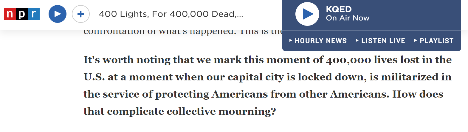 美国国家公共电台(NPR)慨叹,在我们悼念40万美国人因疫情丧生之际,竟然还需要封锁首都,来为保护美国人免受其他美国人的暴力侵害。