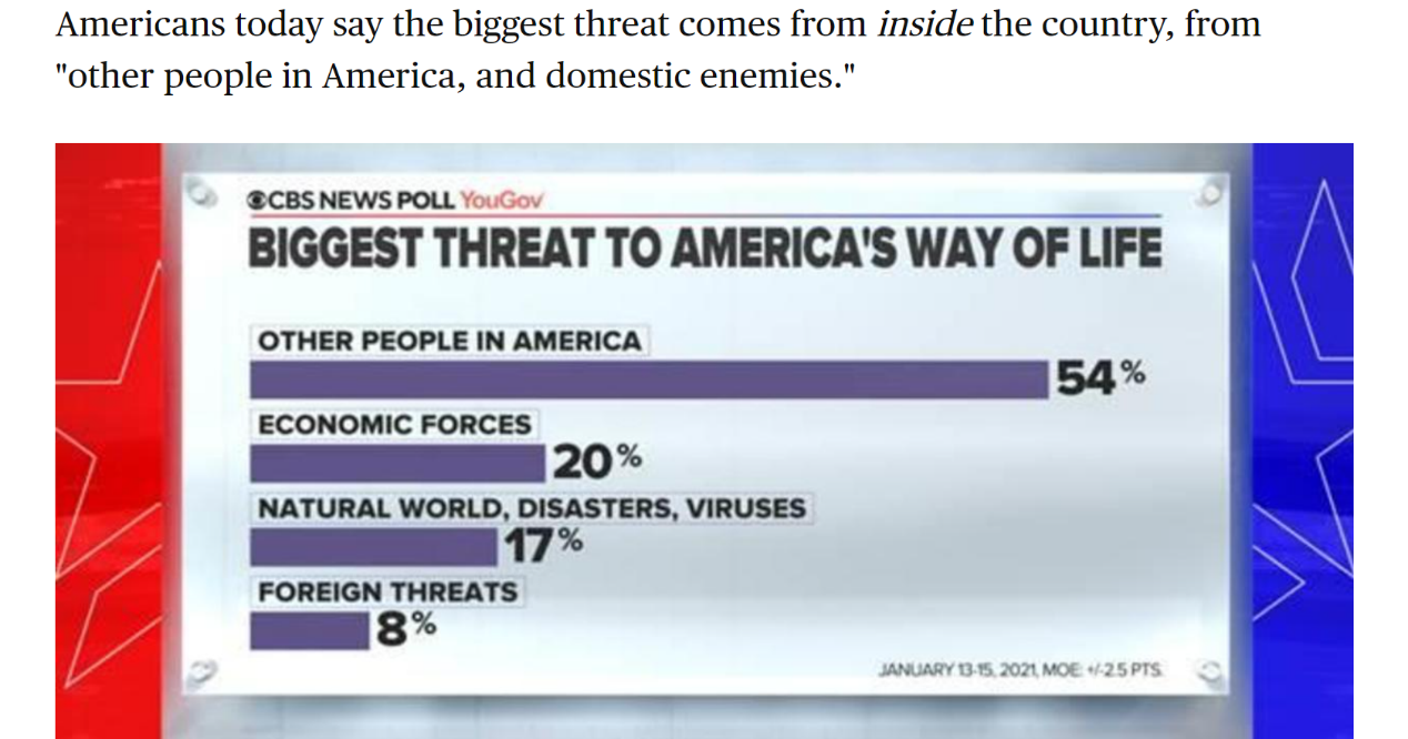 美国哥伦比亚广播公司17日发布的一份民调显示,尽管美国民众普遍认可当前疫情十分严重,但有54%的受访者认为“其他美国人和国内敌人”目前对美国社会构成了“最大威胁”。
