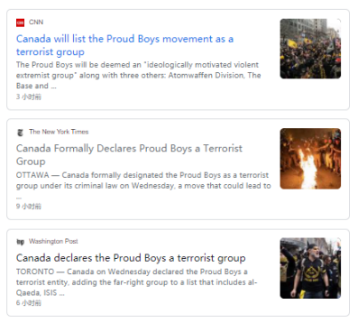 当地时间2月3日,一则消息占据了美国各大主流媒体首页位置——加拿大公共安全部宣布,正式将美国右翼组织“骄傲男孩”(Proud Boy)列为“恐怖主义实体”。加拿大由此成为全球首个将“骄傲男孩”列为恐怖组织的国家。