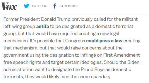 有分析认为,拜登政府打击国内恐怖主义的掣肘因素之一,是当前美国联邦法律中并无指定国内团体为恐怖组织的相关机制。据VOX新闻介绍,前总统特朗普曾呼吁将左翼激进组织反法西斯主义运动(ANTIFA)列为国内恐怖组织,但最终因难以推进立法无疾而终。