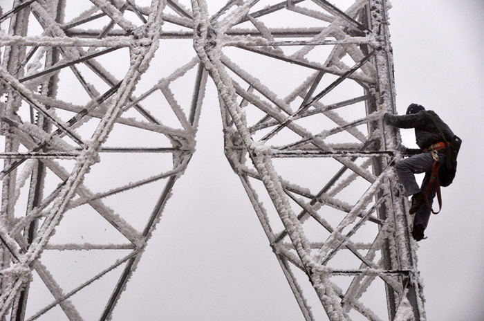 在贵州威宁县观风海镇,电力工人爬上110千伏供电基杆进行除冰作业准备。(图片来源:杨文斌/IC photo)