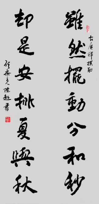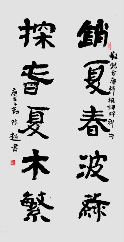 陈超喜欢书写短句、短联。不久前,他专门写了数副我的“中药联”和“词牌联”。中药联“武威/九地,文甲/三苍”和词牌联“销夏/春波绿,探春/夏木繁”,字不重笔,墨随浓淡,可燥可湿。这种无“野气”,“涩味足”之写性作品,令人有“化圆为方,化弧为直”之哲学遐想。本意乃本质,我认为,这种工夫深,精神足之“涩笔说”,最能体现陈超的品性。陈超这种“短长肥瘦各有态”的笔势风格与美学内涵,正是对“字,是人体生命的对应;字,是书者情绪的流露;字,是书者人品的写真”的诠释。我为此撰联记之:才参正统高名誉;笔拌斯文俏法书。