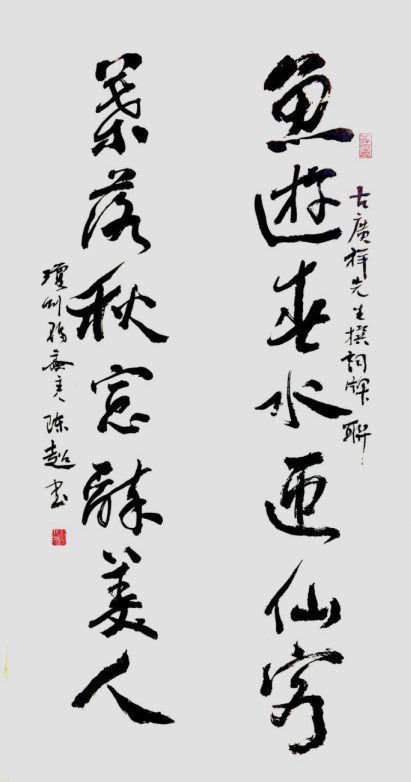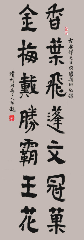 我曾以中药名为美国陈香梅博士撰嵌名联:“香叶/飞蓬/文冠果;金梅/戴胜/霸王花。”并安排陈超书写。此幅作品,笔有主见,墨有节制,这种点曳之工,裁成之妙,看得出陈超对处理技法与字义的关系是经过思考的。