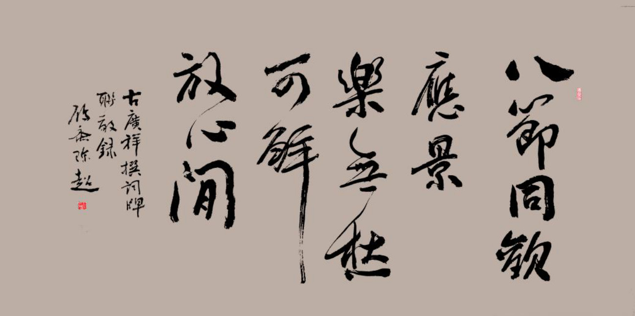 清代文学家刘熙载有曰:书以笔为质,以墨为文。陈超并不是墨守成规的字匠人,他讲究“法度”,他崇尚“意趣”。读者可从这副中药联“海带/长春菊,山连/大季花”和词牌联“八节同欢/应景乐,无愁可解/放心闲”中,感受其果敢之笔和潇洒之墨。这副中药联,简繁兼用,“正”中带“草”,轻重协衡;而词牌联,布局得宜,点划洒脱,有明显的波动性和富于生命力。这种“起笔斗峻,住笔峭拔”的气象,正如拙中药联所概述:章表/通天窍;墨飞/接骨风。