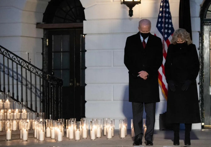 2月22日,美国总统拜登夫妇在白宫为美国新冠逝者默哀。(图片来源:新华社/法新)