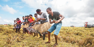 在莫桑比克万宝莫桑农业园,农户在水稻收割现场载歌载舞庆祝丰收。万宝莫桑农业园是中国在非洲最大规模水稻种植项目,极大地缓解了莫桑比克粮食短缺问题。 新华社记者 张 宇摄