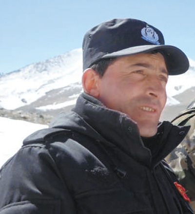 在新疆红其拉甫边境线上,拉齐尼·巴依卡在巡逻途中。新华社发