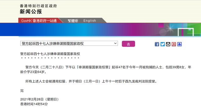 2月28日,香港警方以“串谋颠覆国家政权罪”起诉47名反中乱港分子,包括香港大学法律系前副教授戴耀廷,“社会民主连线”岑子杰,前“港独”组织“香港众志”秘书长黄之锋等,有关人士在今天上午11时后于西九龙裁判法院提堂。