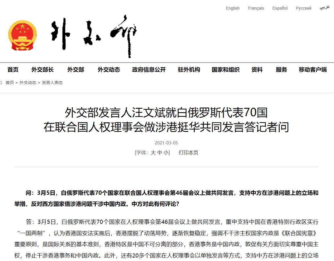 答:3月5日,白俄罗斯代表70个国家在人权理事会第46届会议上做共同发言,重申支持中国在香港特别行政区实行“一国两制”,认为香港国安法实施后,香港摆脱了动荡局势,逐渐恢复稳定,强调不干涉主权国家内政是《联合国宪章》重要原则,是国际关系的基本准则,香港特区是中国不可分离的部分,香港事务是中国内政,敦促有关方面切实尊重中国主权,停止干涉香港事务和中国内政。此外,还有20多个国家在人权理事会以单独发言等方式,支持中方在涉港问题上的立场和举措。