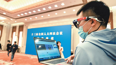 十三届全国人大四次会议“部长通道”现场,人民日报记者借助“人民日报创作大脑·智能创作机器人”拍摄视频并在线“云剪辑”。 本报记者 陈 斌摄