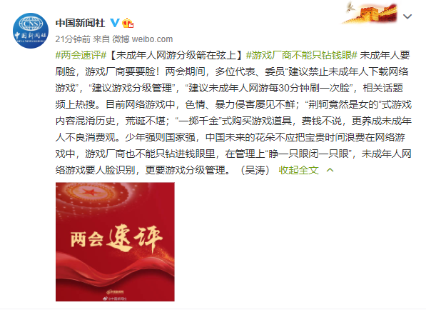 未成年人要刷脸,游戏厂商要要脸!两会期间,多位代表、委员“建议禁止未成年人下载网络游戏”,“建议游戏分级管理”,“建议未成年人网游每30分钟刷一次脸”,相关话题频上热搜。目前网络游戏中,色情、暴力侵害屡见不鲜;“荆轲竟然是女的”式游戏内容混淆历史,荒诞不堪;“一掷千金”式购买游戏道具,费钱不说,更养成未成年人不良消费观。少年强则国家强,中国未来的花朵不应把宝贵时间浪费在网络游戏中,游戏厂商也不能只钻进钱眼里,在管理上“睁一只眼闭一只眼”,未成年人网络游戏要人脸识别,更要游戏分级管理。(吴涛)