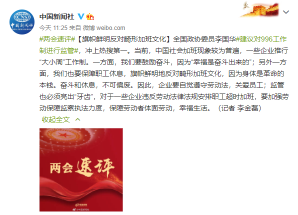 政协委员:建议对996工作制进行监管 反对畸形加班