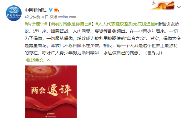 人大代表建议整顿无底线追星话题引发热议。近年来,饭圈骂战、人肉网暴、集资等乱象频出。在一些青少年看来,一切为了偶像,一切服从偶像,粉丝成为被利用被驱使的“乌合之众”。其实,偶像大多是雾里看花,卸妆后不忍目睹不在少数。相反,每一个人都是这个世界上最独特的存在,呼吁广大青少年努力活出精彩,永远做自己的偶像。(袁秀月)