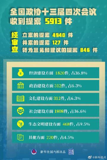 全国政协十三届四次会议共收到提案5913件。经审查,立案的提案4940件,并案的提案127件,转为意见和建议的提案846件。立案的提案中:经济建设方面提案1820件,占36.8%;政治建设方面提案312件,占6.3%;文化建设方面提案312件,占6.3%;社会建设方面提案1808件,占36.6%;生态文明建设方面提案468件,占9.5%;其他方面提案220件,占4.5%。
