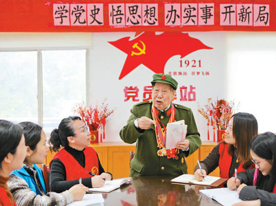 江苏省常州市钟楼区五星街道花园新村第一社区党委邀请94岁老党员夏文贵到党员驿站讲党课。 史康摄(人民视觉)