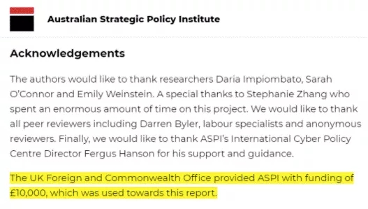 “ASPI报告”由英国外交部资助(图源:“灰色地带”网站)
