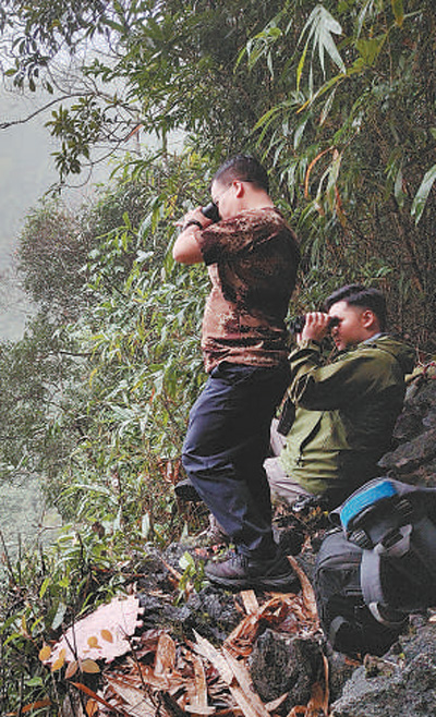 李兴康(左)与林勇坚在观测点跟踪观察长臂猿。人民日报记者 邓建胜摄