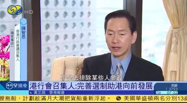 澳华电视传媒(ACTV)据凤凰卫视讯:十三届全国人大常委会第27次会议,29号起一连两天在北京举行。会议将审议涉及香港特区行政长官产生办法的《基本法》附件一修订草案,及涉及香港立法会产生办法和表决程序的《基本法》附件二修订草案。在此关键时间节点,香港行政会议召集人陈智思在香港接受凤凰卫视记者独家专访。他表示,过去很长一段时间,香港政治争拗不断,议会无法正常处理社会民生问题;认为完善香港相关选举制度能确保有能力的爱国者治港,对“一国两制”行稳致远至关重要。他又就完善选制对香港行政立法关系造成的影响、对未来“治港者”及议会的期望、香港与国家发展关系、担任行会召集人的心路历程,及自己会否参选下届特首等问题,做出详细回答。