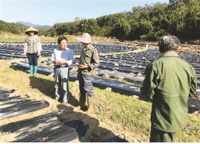 2019年11月21日,杨小锋(左二)指导那受村的农户铺设全生物降解地膜。资料图片