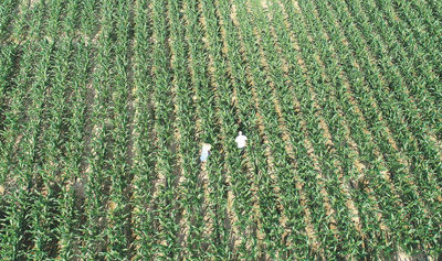 2月24日,玉米育种专家在三亚南繁育种基地观察玉米生长情况。新华社记者 张丽芸摄