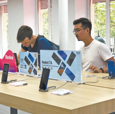 在位于巴黎香榭丽舍大街的小米旗舰店内,顾客正在试用产品。 本报记者 刘玲玲摄