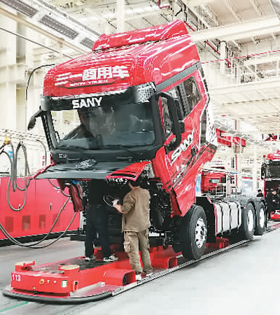 3月26日,位于长沙经开区的三一重卡生产线上,工人正在装配零部件。 本报记者 王俊岭摄