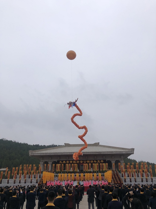 接着举行盛大的乐舞告祭,在庄穆、宏放的音乐声中,一条56米长的金色巨龙腾空而起,承载着炎黄子孙对人文初祖无限崇敬与感恩之心、承载着实现中华民族伟大复兴的中国梦,飞入云霄。