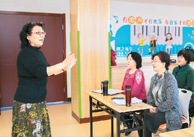 近年来,内蒙古呼和浩特市玉泉区以居家和社区综合养老服务中心为载体,为老人提供休闲娱乐、基本医疗、餐饮等服务。图为3月27日,老人在玉泉区四里营西社区综合养老服务中心练习声乐。丁根厚摄(人民视觉)