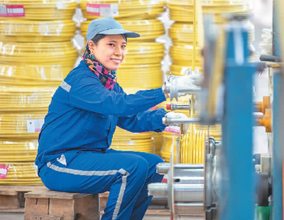 海南美亚高性能铜加工材生产基地是2021年海南自由贸易港建设项目第一批集中开工的项目,建成后预计将生产10万吨/年的高性能光亮铜杆、精密超薄铜箔、高精度铜管等产品。图为工人在海南美亚电缆集团有限公司车间加工电线电缆。袁琛摄(人民视觉)